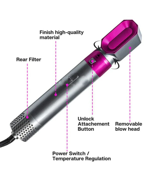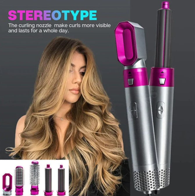 Choose from the five attachments, hot air brush, blow dryer with comb, blow dryer brush, 5 IN 1 hot air brush, hot air brush, heat hair brush, or blow dry curls from Our 5 in 1 Hair Dryer Styling Tool to give you goddess curls and styles at home in the nick of time without damaging your hair.