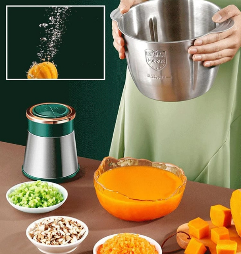 - Its powerful motor and 4 stainless steel blades enable you to grind fruits, vegetables, meat, nuts, sauce, and even baby food in seconds.