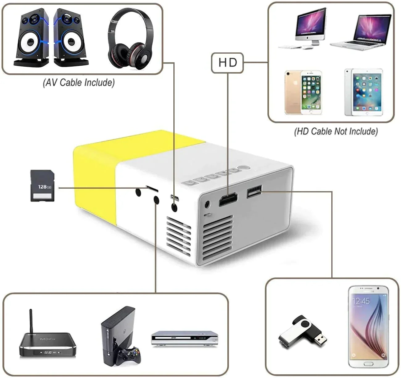 Small projector is equipped with multiple ports, including HDMI, USB, audio, AV and Type-C interfaces. It can be easily connected to multiple media devices, such as TV boxes, laptops, desktop computers, digital cameras, phone, switch, HDMI-enabled devices to play video, TV series, photos sharing and games etc.